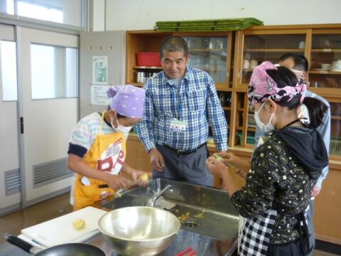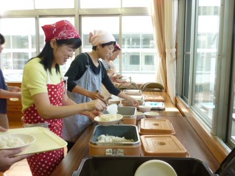 家庭科室からいいにおいがしていました。のぞいてみると、ごはんと味噌汁などを作っていました。4名の学習ボランティアの皆さんにも包丁の使い方などを支援していただき、美味しくできあがりました。
