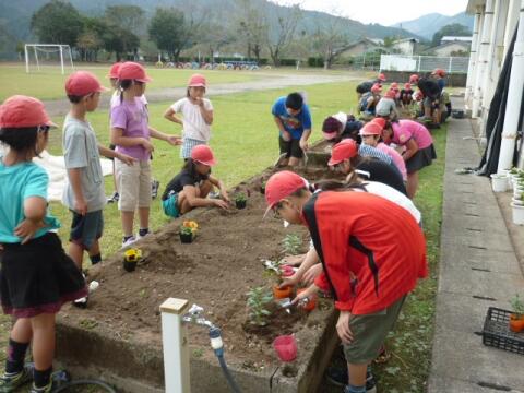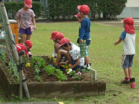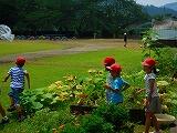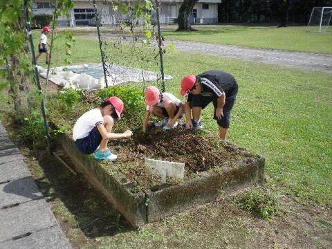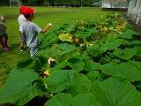 花壇の中央に植えたカボチャの苗が、見る見るうちに花壇からはみ出し運動場にむかって生長しています。どこまで生長するのでしょう。楽しみです。