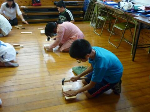 3・4年生が、森林環境教育実践事業の取組を受け、飫肥杉について、話を聞いたり、飫肥杉を使って、小物を作ったりしました。はじめは、うまく金づちを使えなかった子どもも、作っていくうちに上手になっていきました。また、飫肥杉のよさや利用方法なども学ぶことができました。