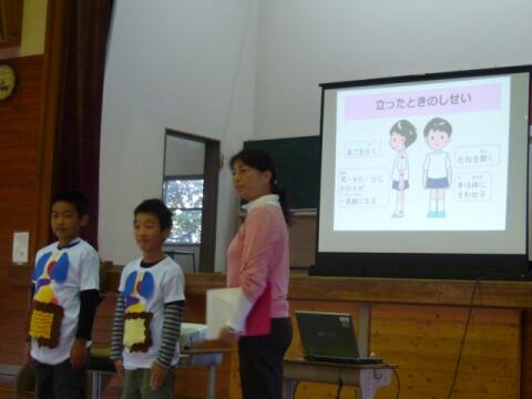 朝の時間に体育館で、「しせい」について学びました。保健室の先生や委員会の子どもが、プレゼンを使ったり、体の仕組みが分かるTシャツを見せたりしながら、「正しい姿勢」について、分かりやすく説明しました。学校では、「足ペタ・ピン・トン」を合い言葉に、正しい姿勢にみんなで取り組んでいます。