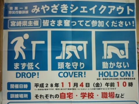 午前10時、全国一斉に行われた「緊急地震速報の訓練(シェイクアウト訓練)」に参加しました。シェイクアウト訓練とは、地震の際の安全確保行動「①まず低く、②頭を守り、③動かない」を身に付ける訓練です。・・・約1分間の訓練でしたが、真剣にできました。