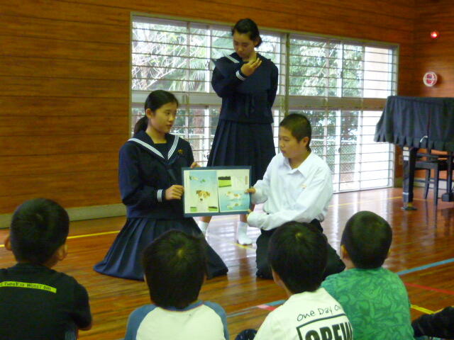今朝、体育館において、榎原中学校の生徒による読み聞かせがありました。低・中・高学年の3つのグループに分かれて、読み聞かせや本の紹介などがあり、小学生も感想を発表していました。心温まる活動でした。