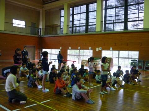 今日の昼休み時間は、みんなで遊ぶ日です。 全校で遊びます。遊びは、2年生が決めた「ころがしドッジボール」です。まず、最初に約束事を確認して2チームに分かれて、ゲーム開始です。みんな仲よく遊ぶことができました。