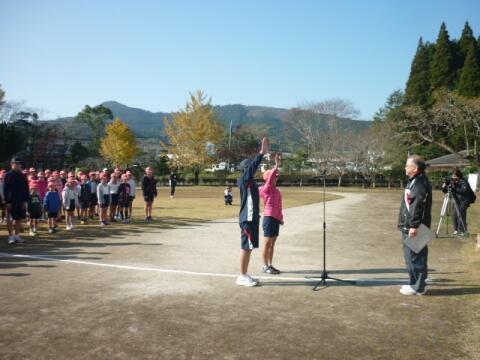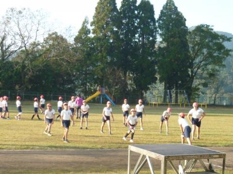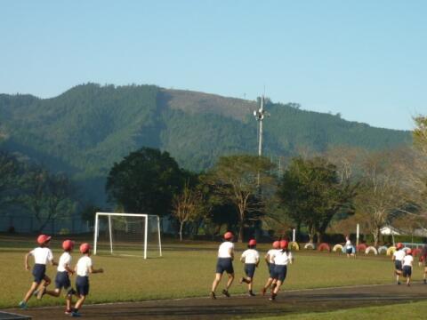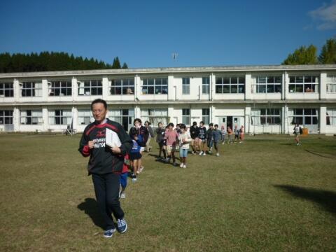 12月9日の参観日に、榎原中学校と合同で駅伝・持久走大会があります。朝の活動の時間に全校で練習をしました。子どもたちは、準備運動をした後、5分間、自分のペースで走りました。