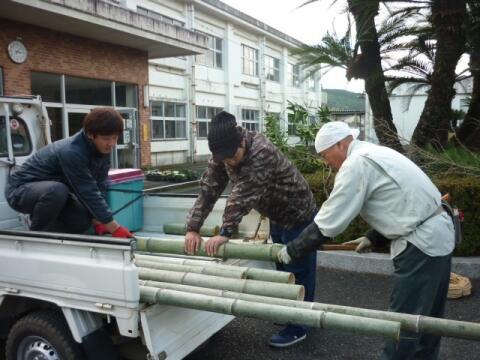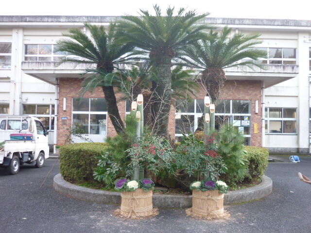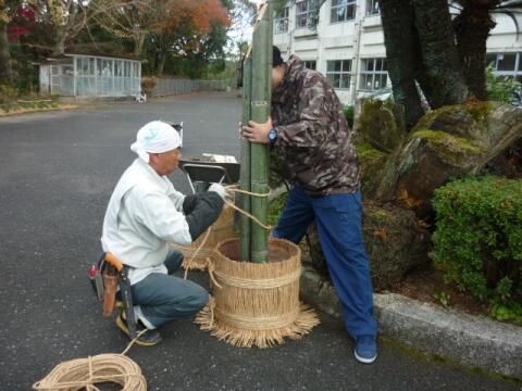 地域に在住で、元榎原小学校の職員だった方が、午後から門松をつくってくださいました。PTA三役の皆さんにもお手伝いしていただきました。とても立派な門松ができあがりました。子どもたちもびっくりすると思います。榎原中学校の運動場門の前にも門松が午前中にできあがりました。これも地域の方がつくられました。このように「榎原」は、地域の方々が、子どもたちや学校のために深い愛情で協力してくださいます。ありがとうございます。