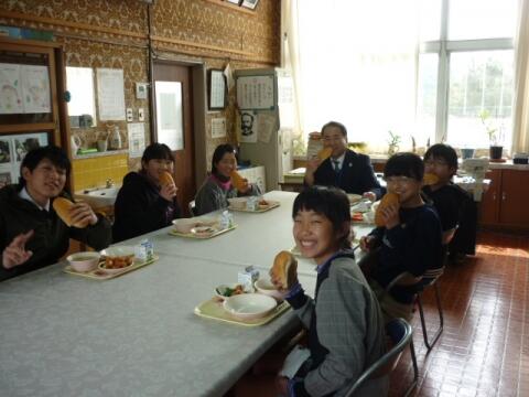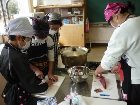 地域の食文化に触れる体験として、総合的な学習の時間に「かつおめし作り」をしました。外浦漁協女性部の方々や学習支援ボランティアの皆さんにご協力いただきながら、学習を進めました。漁協の方が、一本10㎏のかつおをさばく時は、子どもたちもびっくりしながら見入っていました。その後、子どもたちも包丁を使って、指導を受けながらかつおを切り身にしていきました。・・・とっても美味しいかつおめしができあがりました。