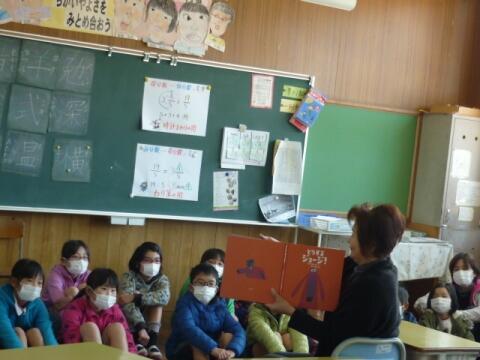 いつもは、低・中・高に別れて、読み聞かせをしていただいていますが、今日は、低と中・高の2つに別れて聞きました。低学年では、「さるのせんせいとかんごふさん」などを、中・高学年では、「まくらのせんにん~さんぽみちの巻」などを読んでいただきました。