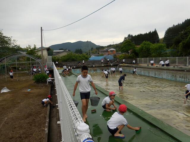 本年度がスタートして1ヶ月半が経ちました。16日(火)は、水泳学習のためにプール清掃を榎原中学校生徒と合同で行いました。一年ぶりの清掃は、大変でしたが、みんなで力を合わせて清掃をしました。いよいよ水泳学習のプールの準備が整いました。