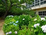 体育館横の「紫陽花」が色とりどりの花を咲かせ、「梅」の木も実を付けています。校内で6月の季節を感じる場所になっています。