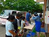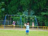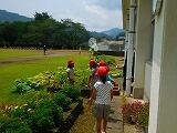 昨日の集中豪雨から一転した晴天の下、子ども達は、タイヤ跳びやサッカー、ブランコ、虫取りなどで運動場を走り回ったり、歓声をあげたり汗だくになり遊んでいました。
