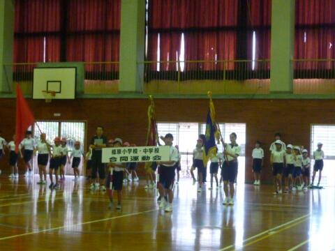 運動会の第1回目の小中合同練習を行いました。運動場の状態が悪く、地域の体育館で練習しました。本番が雨天の場合は、この体育館で実施するため、子どもたちも位置を確認しながら、真剣に取り組みました。中学生の元気な声や機敏な動きは、小学生にとって、とてもよい手本になりました。