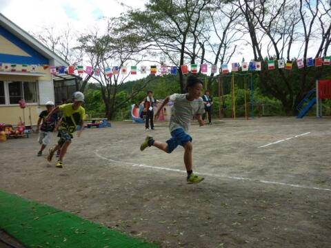 お昼休みにALTのアリアン先生と全校児童で遊びました。陣取り遊びをしました。子どもたちは、アリアン先生を追いかけたり、追いかけられたりで、楽しく過ごすことができたようです。