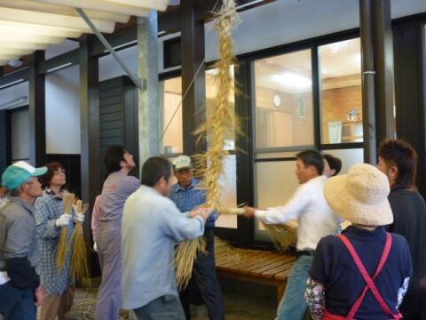上講地区の十五夜祭りでしたが、あいにくの雨で綱引きや相撲などはありませんでした。しかし、集会所では、藁で龍作りが行われていました。藁だけを使っての龍作りは、見ごたえがありました。最後は、できあがった龍を榎原神社に奉納しました。