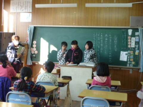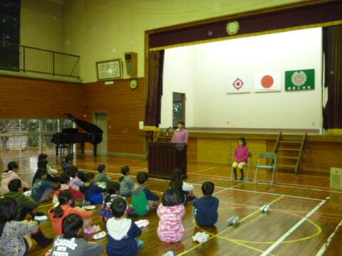 毎回子どもたちが楽しみにしています。低学年では「ちょっとだけまいご」「おいしいラーメンもういっぱい!」、中学年では「しょうじき250円ぶん」「ほこほこのがっこう」、高学年では「マーシャとくま」「かえるのじいさまとあめんぼおはな」を読んでいただきました。心が温かくなりますね。