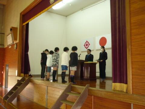 第108回卒業式を行いました。男子2名、女子6名が卒業しました。式では、卒業生一人一人が、自分の夢やそのために中学校で頑張ることを発表しました。その言葉や気持ちは、しっかり会場に来ていたご来賓、保護者、地域の方々へ伝わったと思います。