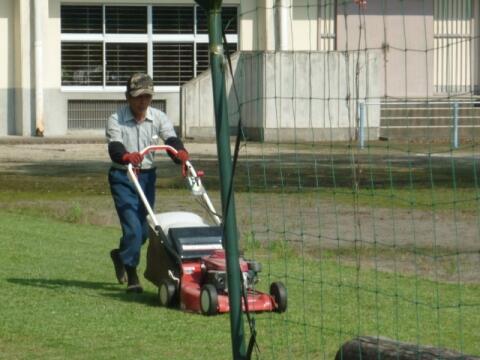 環境整備員の皆さんに来ていただき、運動場の草刈り等をしていただいています。今日から数日かかるそうです。運動場がきれいになったら、いよいよ運動会の練習が始まります。