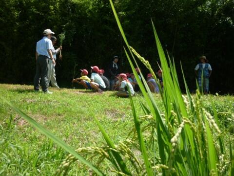 5・6年生が、地域コーディネーターの方やボランティアの皆さんと一緒に、4月に田植えをした稲の観察に行きました。田んぼでは、はじめにコーディネーターの方から稲の育ち方等の説明を聞きました。その後、大きくなっている稲を自分の目や手で観察しました。