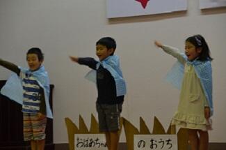 1・2年生 劇「赤ずきんちゃん」で家事やそうじの仕方を披露しました。