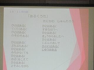 今月の全校朝会は「心で感じて、伝える」をテーマでお話をしました。谷川俊太郎さんの「かっぱ」「歩くうた」の詩をみんなで読んでみました。はじめてにしては、みんな元気に声が出ていました。今月もたくさんのことを学んでいきましょう。
