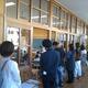 地震の揺れがおさまったという想定で、先生の指示で静かに速やかに整列し、頭部を保護して避難!