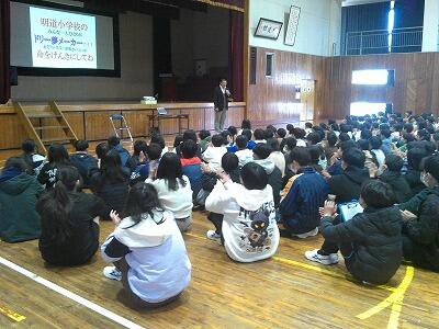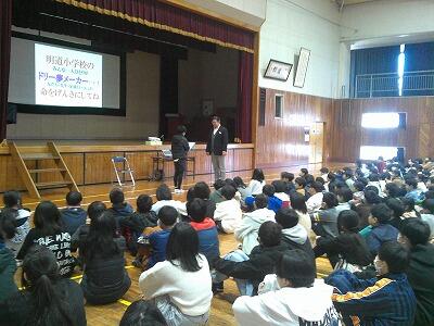 今回は、明道小学校からでした。しかも、「都城市ふるさと給食の日」の特別イベントとして、「耳恋in昼休み時間」を体育館で行いました。