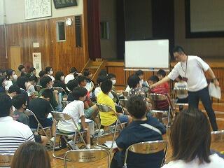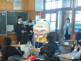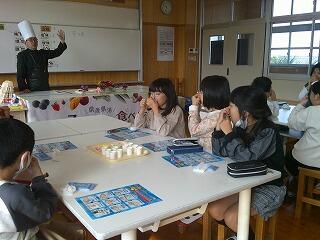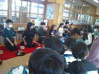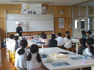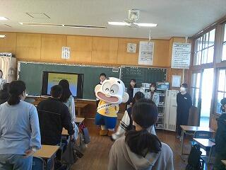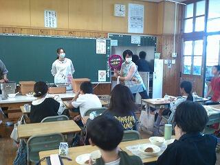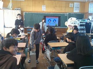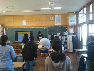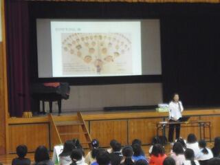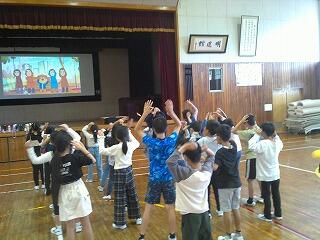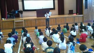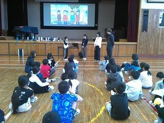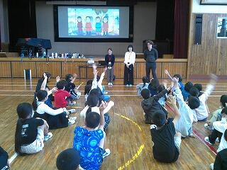 今回は、明道小学校からでした。しかも、「都城市ふるさと給食の日」の特別イベントとして、「耳恋in昼休み時間」を体育館で行いました。