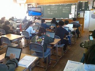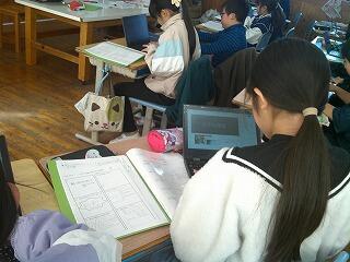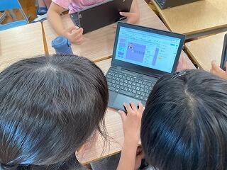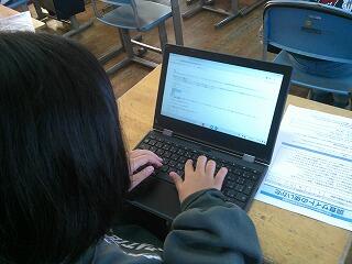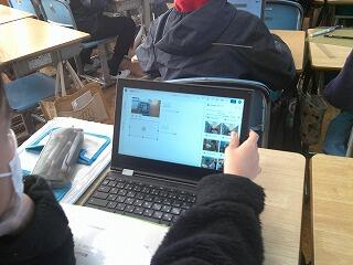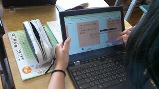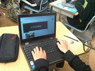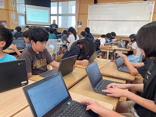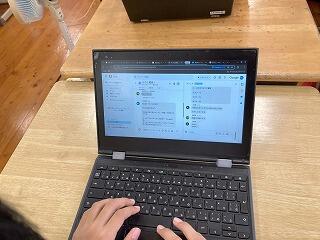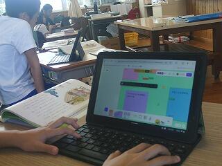 先生と一斉にという形だけでなく、グループでの学習がどの教科でも多くあります。そんな時には、パソコンは、考えを書き込んだり共有したりして意見交換の道具としても活用しています。
