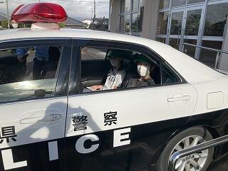 パトカーに乗って、市役所前を出発し、明道小の子ども達が登校する中を、交通安全を呼びかけるアナウンスをしました。