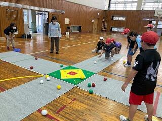 社会福祉協議会、地域の民生委員児童委員の皆様が来校し,4年生に軽スポーツを教えてくださいました。