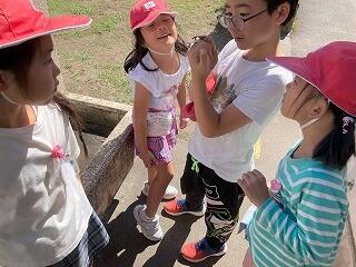 1年生に囲まれて質問攻めの上級生。カマキリを見せながら優しく教えていました。