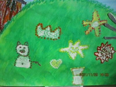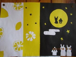 色画用紙を切り抜き、背景の色画用紙の色を生かす、切り絵的作品です。