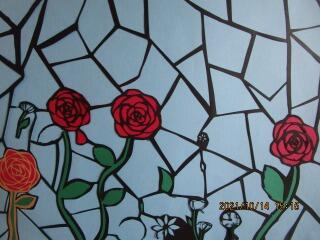 分かりますか?黒が切り抜きに残された線です。細く細く切り抜き、バラの背景に赤紙を配しています。