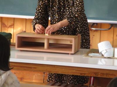 これをああして、こうして、こうするんですよ。保健室先生、ていねいに説明。
