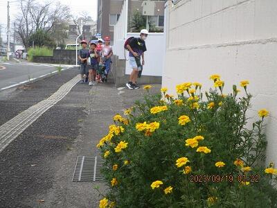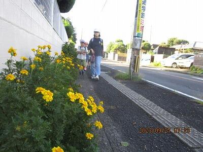 児童の登校を見守る、マリーゴールド。
