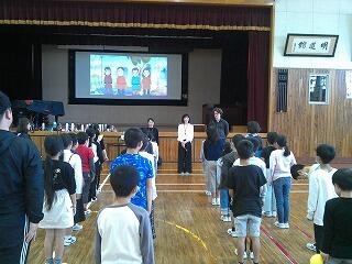 寒い朝でしたが、全校児童が体育館に集まり、全校朝会を行いました。