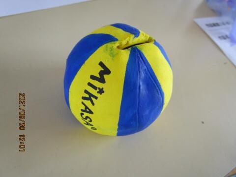 ていねいに作られた、バレーボール貯金箱。ミカサのロゴがすごい。