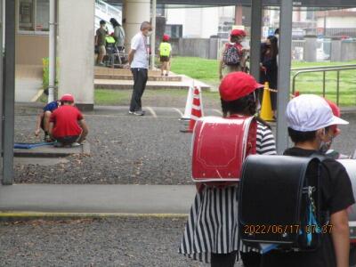 目立つ、あいさつ隊のその背後で動く、ボランティアあり。