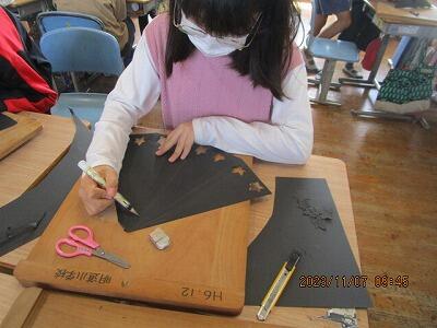 黒紙を切り抜いて、そこに薄い色紙を貼ります。