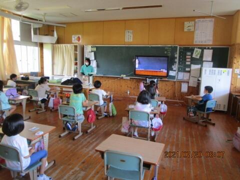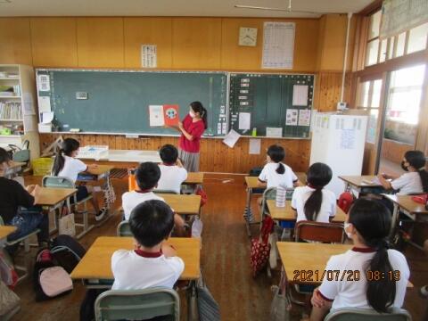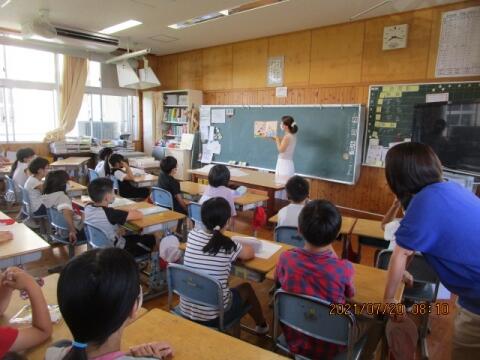 今回は、コロナ禍での実施ということで、ディスタンスをとり、OHCで本を拡大投影し、特別な形での実施となりました。