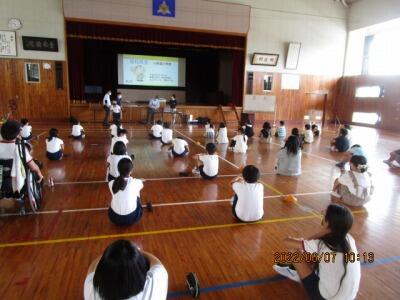 6年生、ディスタンスをとり、お話に聞き入りました。