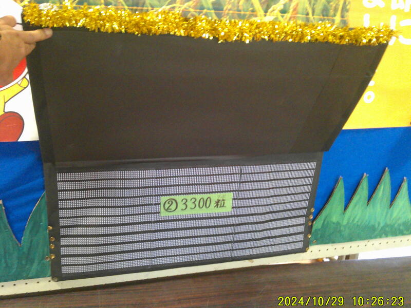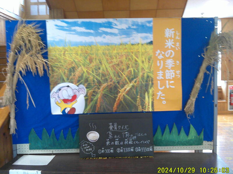 本物の稲穂を生かした、ご飯がもっと食べたくなるような掲示です。