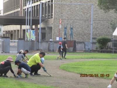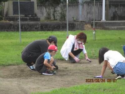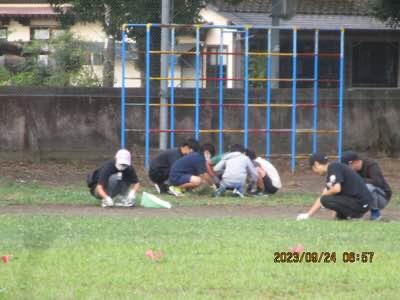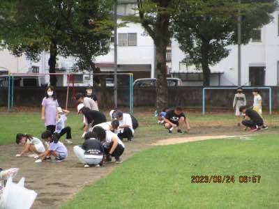 運動会に向けて、除草、整地など、みんなで、運動場整備中。