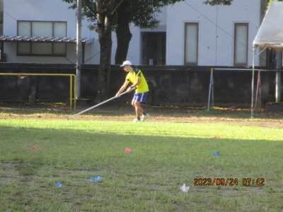 体育先生、一生懸命に運動場整備。