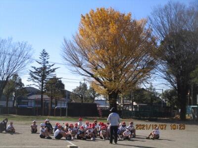 みんなで、笑いながら、元気に、先生と一緒に落ち葉はき、すばらしい!
