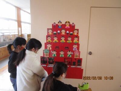 さて、今度は、校長室前の廊下に、ひな飾りが登場しました。