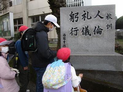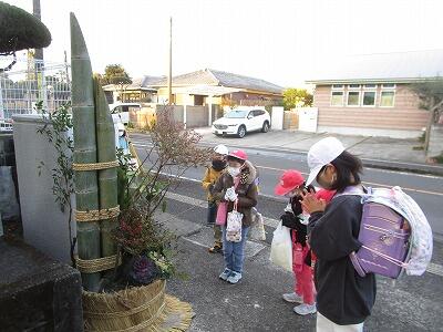 門松にお参りした明道っ子、足取り軽く、登校していきました。