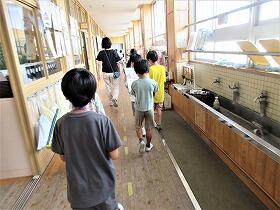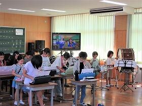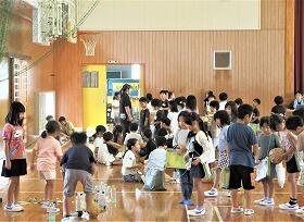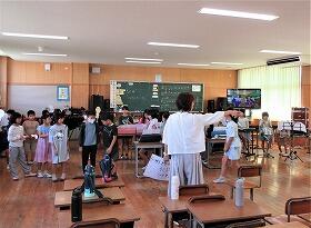 1年生は算数のひきざんの学習、2年生は道徳の学習、3年生は国語の漢字の学習でした。4年生と5年生は水泳の予定でしたが、雷が鳴っていたために、体育館での学習になりました。保護者の方も参加する場面がありました。6年生は、音楽と家庭科の学習でした。