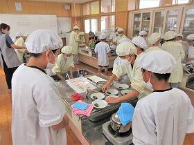 給食当番の子どもたちは、いつも無言で協力し合っています。