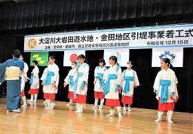 12月15日に、国の事業である大岩田遊水地の着工式があり、アトラクションとして、下長飯手拍子踊りを5年生・6年生の参加できる子どもたちが踊りました。多くのお客様を前に、子どもたちはとても緊張していましたが、すばらしい踊りを披露していました。鍬入れにも参加でき、とてもいい経験になりました。踊りの内村先生をはじめ、たくさんの方にお世話になりました。ありがとうございました。