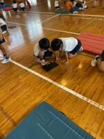 画面を見ながら自分の技、友達の技をチェックしていました。グループでチェック、ふたりでチェック、ひとりでチェック!「ひざがピーンとのびてる、いいね!」「右手をもっとのばしたらかっこいいよ!」・・・。もっと上手になりたい、とタブレットを使いながら練習に取り組んでいる3年生です。